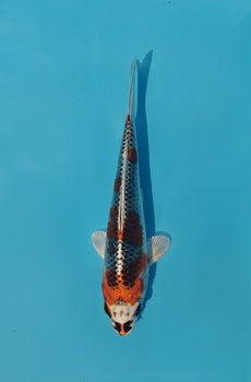 Kujaku koi for sale, a metallic Gosanke-derived variety known for reticulated matsuba patterning overlaying vibrant beni on bright hikari skin. The combination of metallic lustre and netted patterning gives Kujaku a striking, refined appearance in the pond. Our Kujaku are sourced from trusted Japanese breeders and selected for balance, clarity, and long-term development.