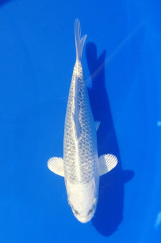 Platinum Ogon koi for sale, a metallic variety prized for its pure white colour and mirror-like hikari lustre. Judged on skin quality, uniformity, and body conformation rather than pattern, Platinum Ogon offer striking presence through simplicity. Our Platinum Ogon are sourced from trusted Japanese breeders and selected for clarity, shine, and long-term quality.